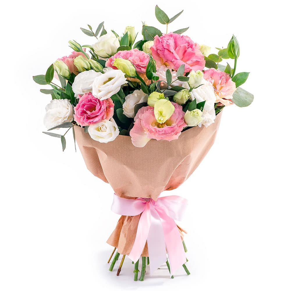 Эустома микс (белая, розовая), эвкалипт. Упаковка (лента, пленка, крафт, сетка, пленка матовая)