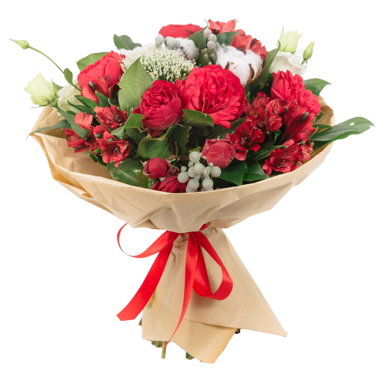 Роза одноголовая пионовидная красная, альстромерия красная, эустома белая, бруния, хлопок. Упаковка (лента, пленка, крафт, сетка, пленка матовая)