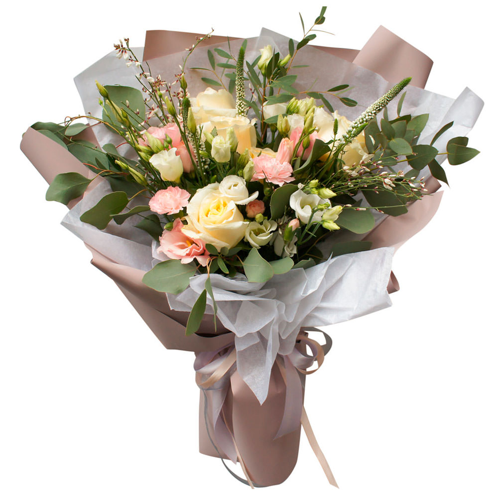 Роза одноголовая кремовая, эустома розовая, хризантема кустовая мини розовая, вероника, эвкалипт. Упаковка (лента, пленка, крафт, сетка, пленка матовая)