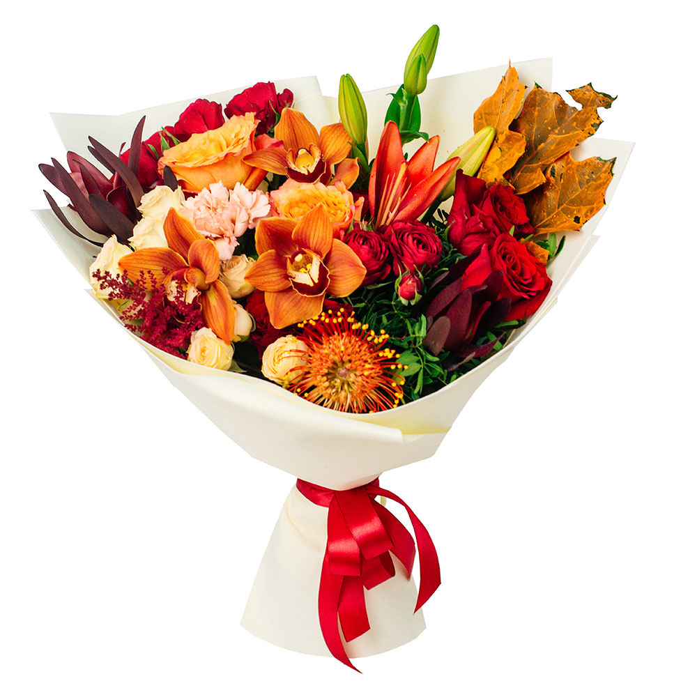 Орхидея оранжевая, лилия оранжевая, роза одноголовая красная,, леукодендрон, леукоспернум, листья клена, гвоздика нежно-розовая, роза кустовая красная и кремовая, астильба. Упаковка (лента, пленка, крафт, сетка, пленка матовая)