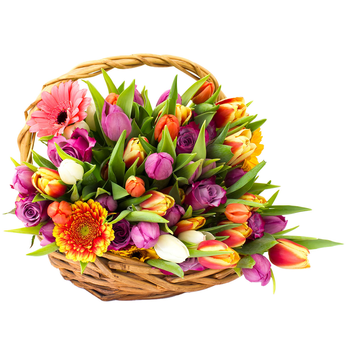 Гербера желтая, розовая и оранжевая, роза одноголовая сиреневая, тюльпан желто-оранжевый, белый и розовый.Упаковка (Корзина, оазис, ящик).