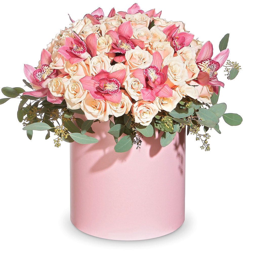 Роза кустовая кремовая, орхидея розовая, эвкалипт. Упаковка (шляпная коробка, квадратный бокс, коробка сердце, оазис)