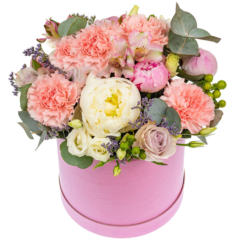 Пион микс (белый, розовый, сиреневый), гвоздика розовая, роза одноголовая сиреневая, эустома белая, гиперикум, альстромерия розовая, эвкалипт. Упаковка (шляпная коробка, квадратный бокс, коробка сердце, оазис)